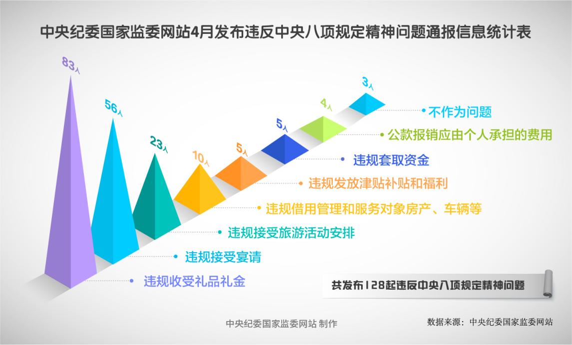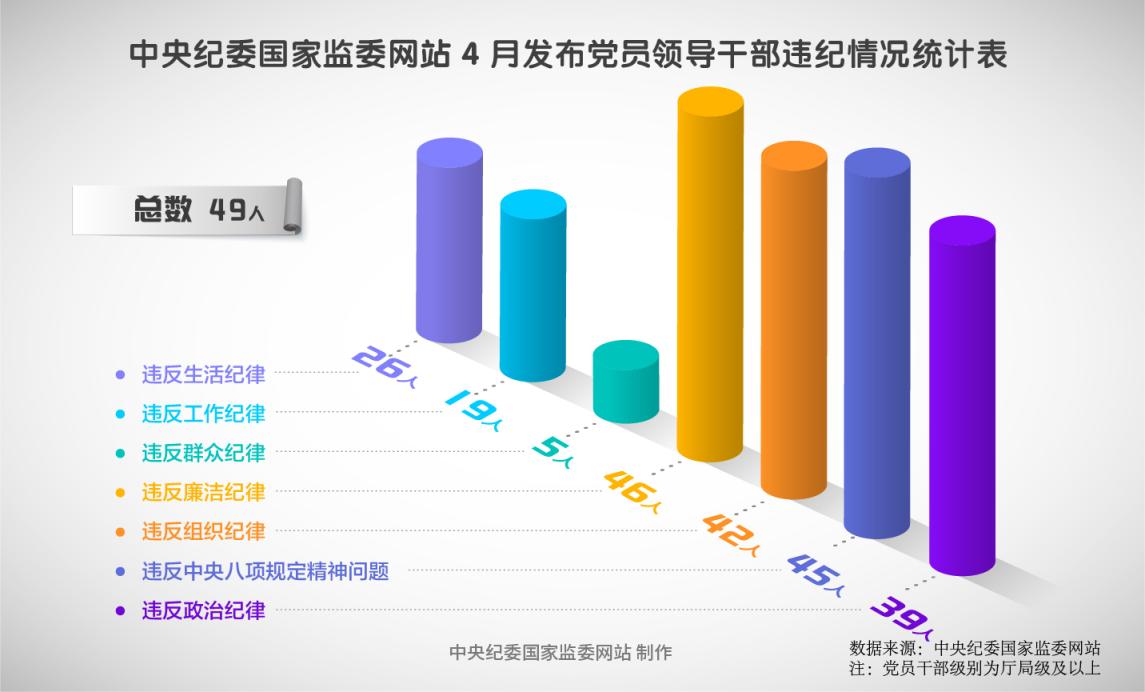 2025年4月,在中央纪委国家监委网站发布的49条党纪政务处分通报中,46人违反廉洁纪律,45人违反中央八项规定精神问题,42人违反组织纪律,39人违反政治纪律,26人违反生活纪律,19人违反工作纪律,5人违反群众纪律。