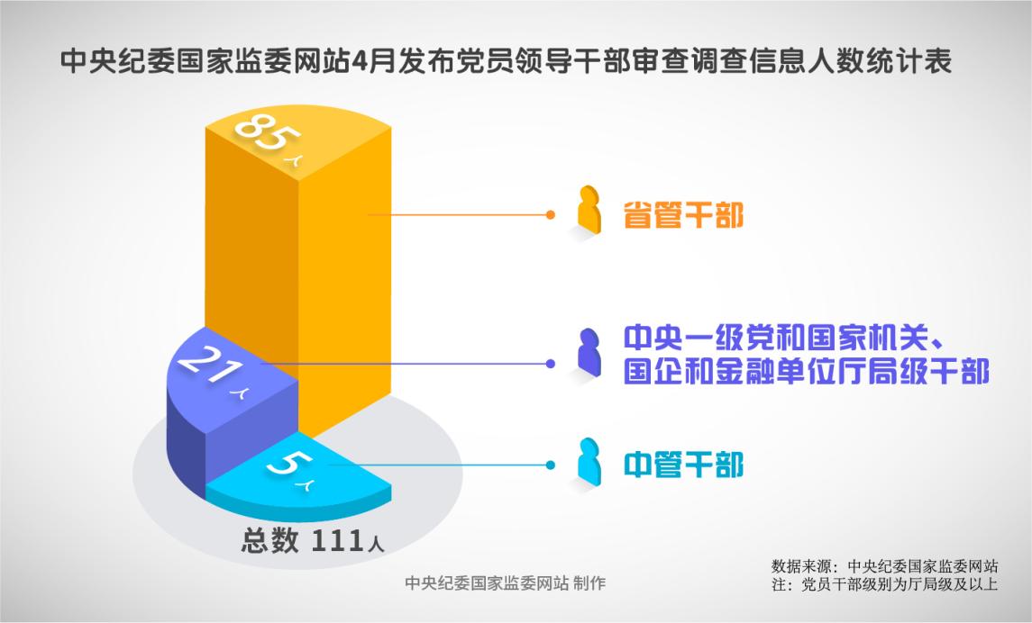 2025年4月,中央纪委国家监委网站共发布111条审查调查信息。其中,中管干部5人,中央一级党和国家机关、国企和金融单位厅局级干部21人,省管干部85人。