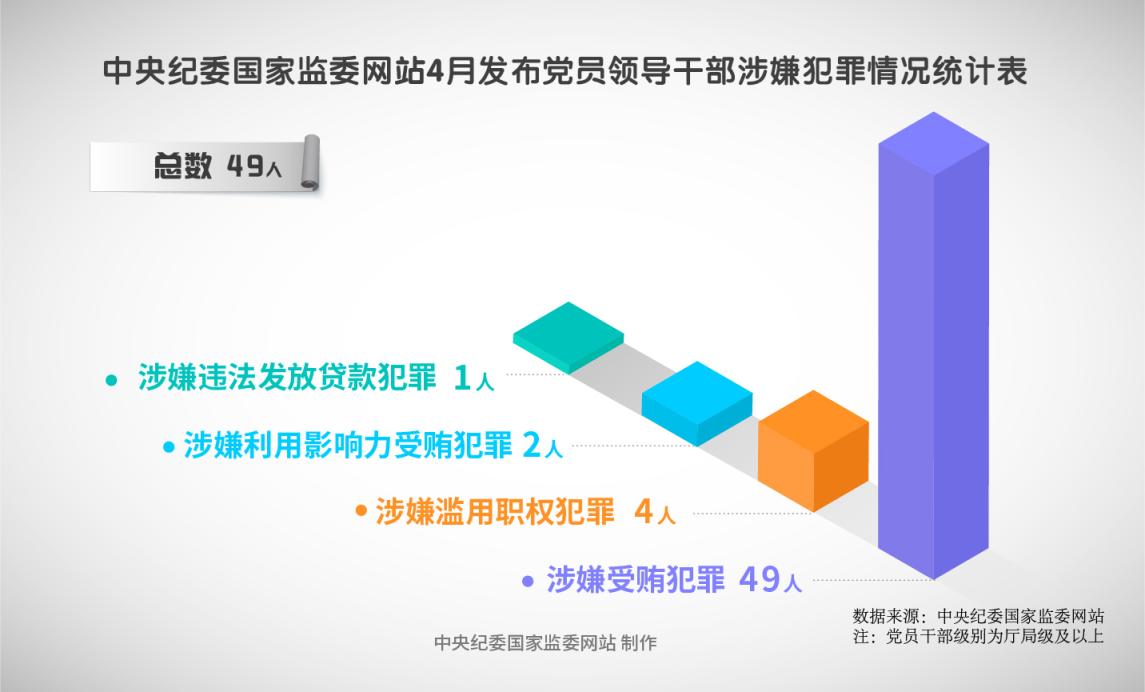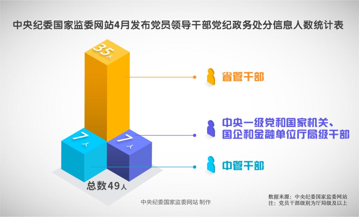 2025年4月,中央纪委国家监委网站共发布49条党纪政务处分信息。其中,中管干部7人,中央一级党和国家机关、国企和金融单位厅局级干部7人,省管干部35人。