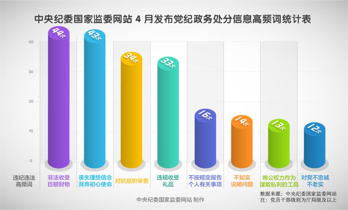 2025年4月,在中央纪委国家监委网站发布的49条党纪政务处分通报中,“非法收受巨额财物”出现频率最高,达44次。此外,丧失理想信念,背弃初心使命、对抗组织审查、违规收受礼品、不按规定报告个人有关事项出现频率较高,分别为43次、34次、33次、16次。